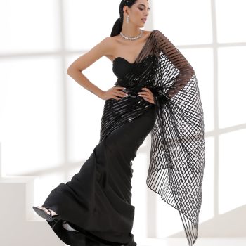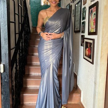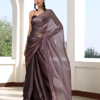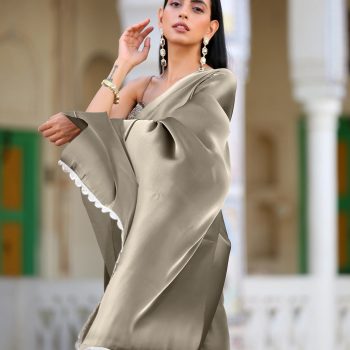Grey Gold Chiffon Saree With Lace & Pendant on Ends