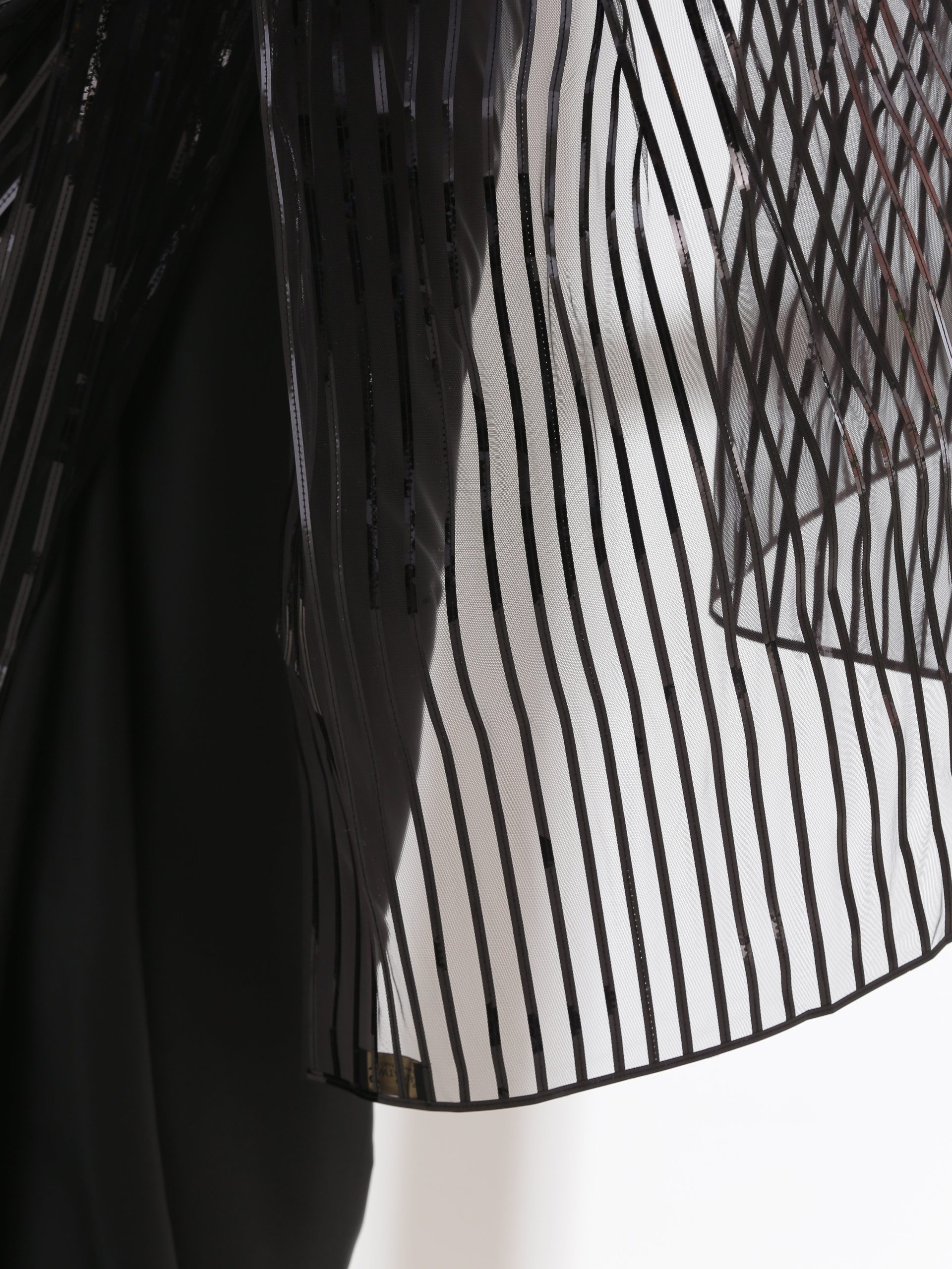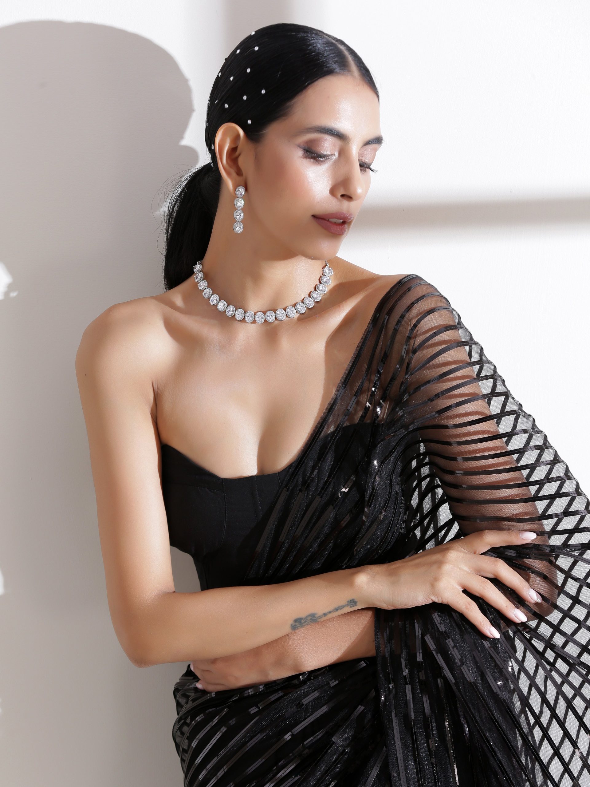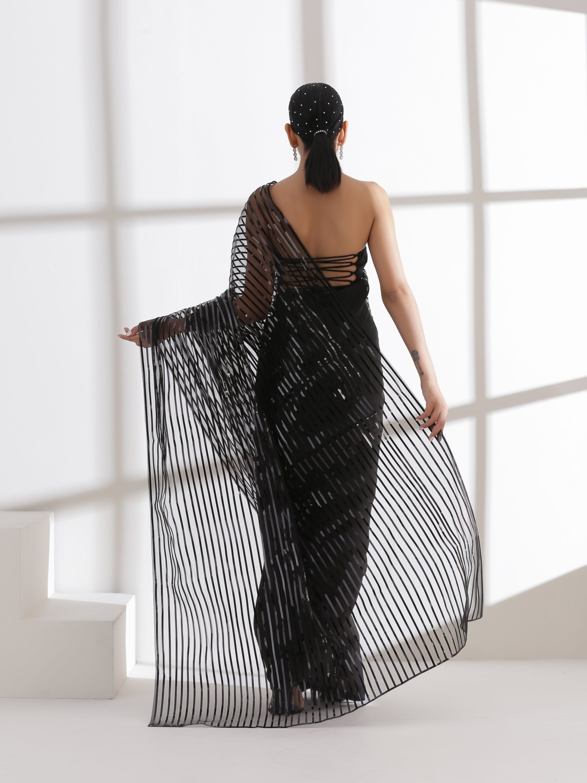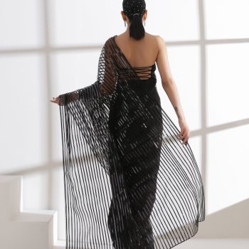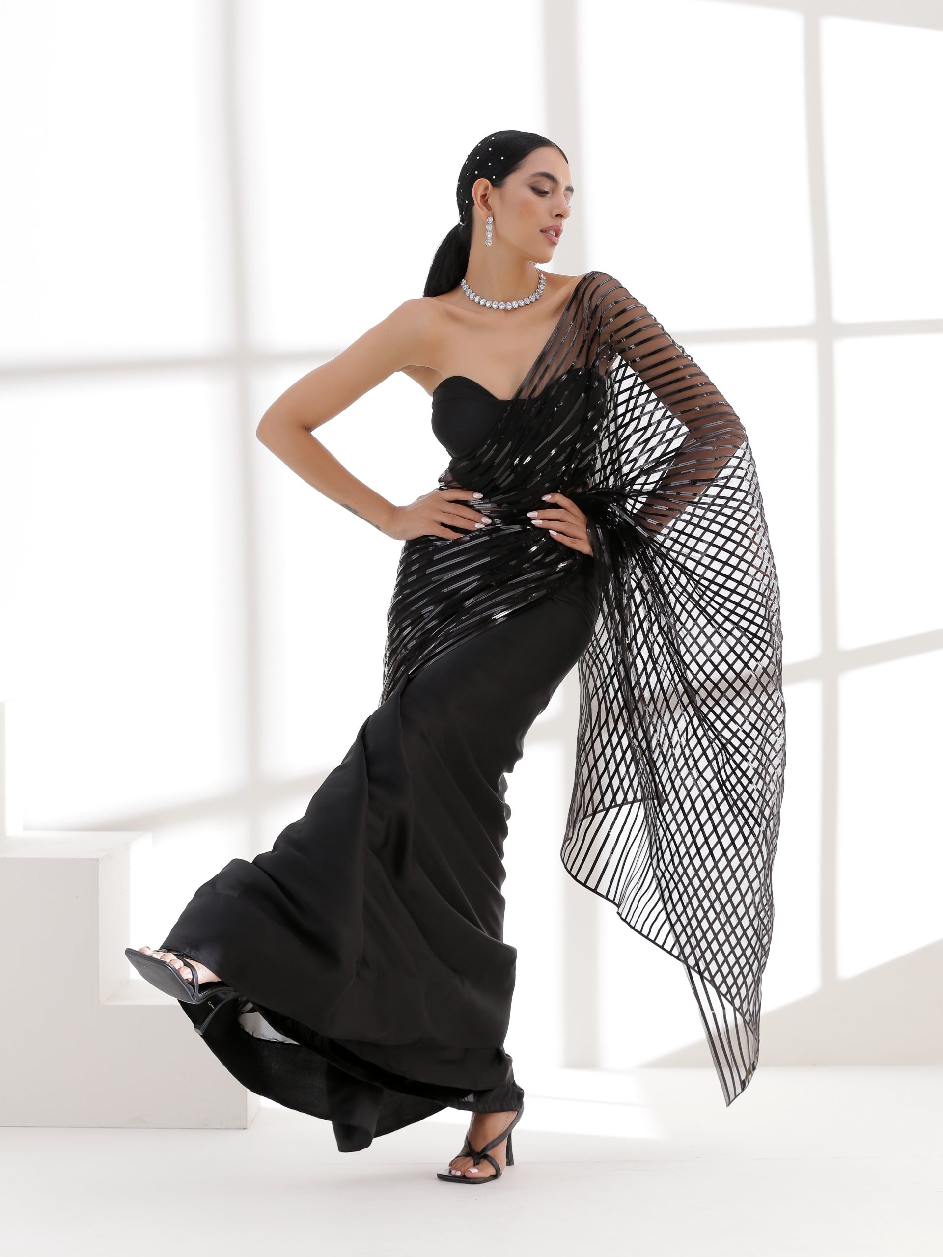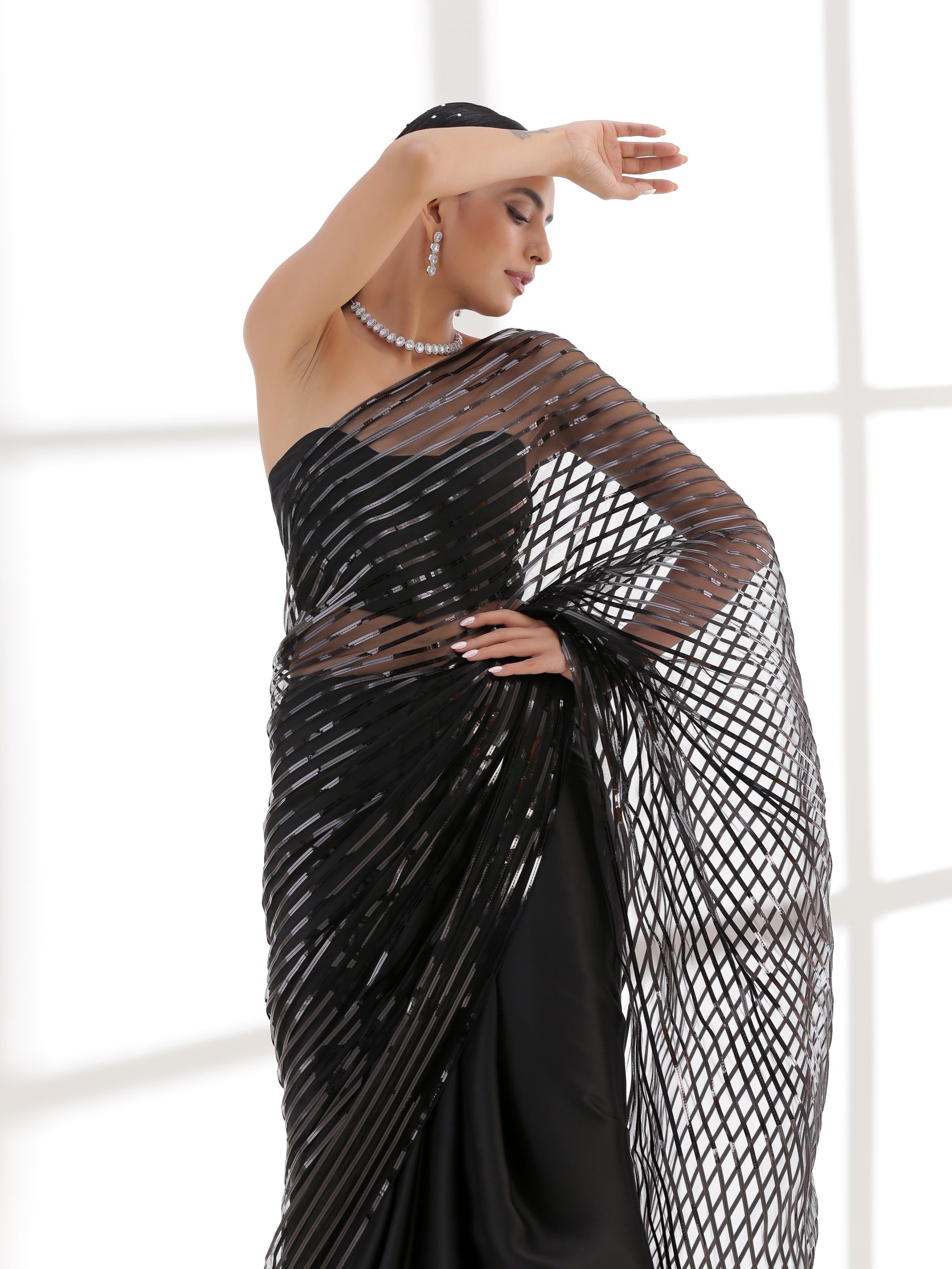 Fabric:- Rich Black Satin- It has a luxurious color and drape. Saree with?Transparent Net Pallu and front with Black stitched Glossy stripes on the entire Pallu look makes the look unique and attractive. The pallu has an stiffer feel due to the stripes to give that Oomph factor.