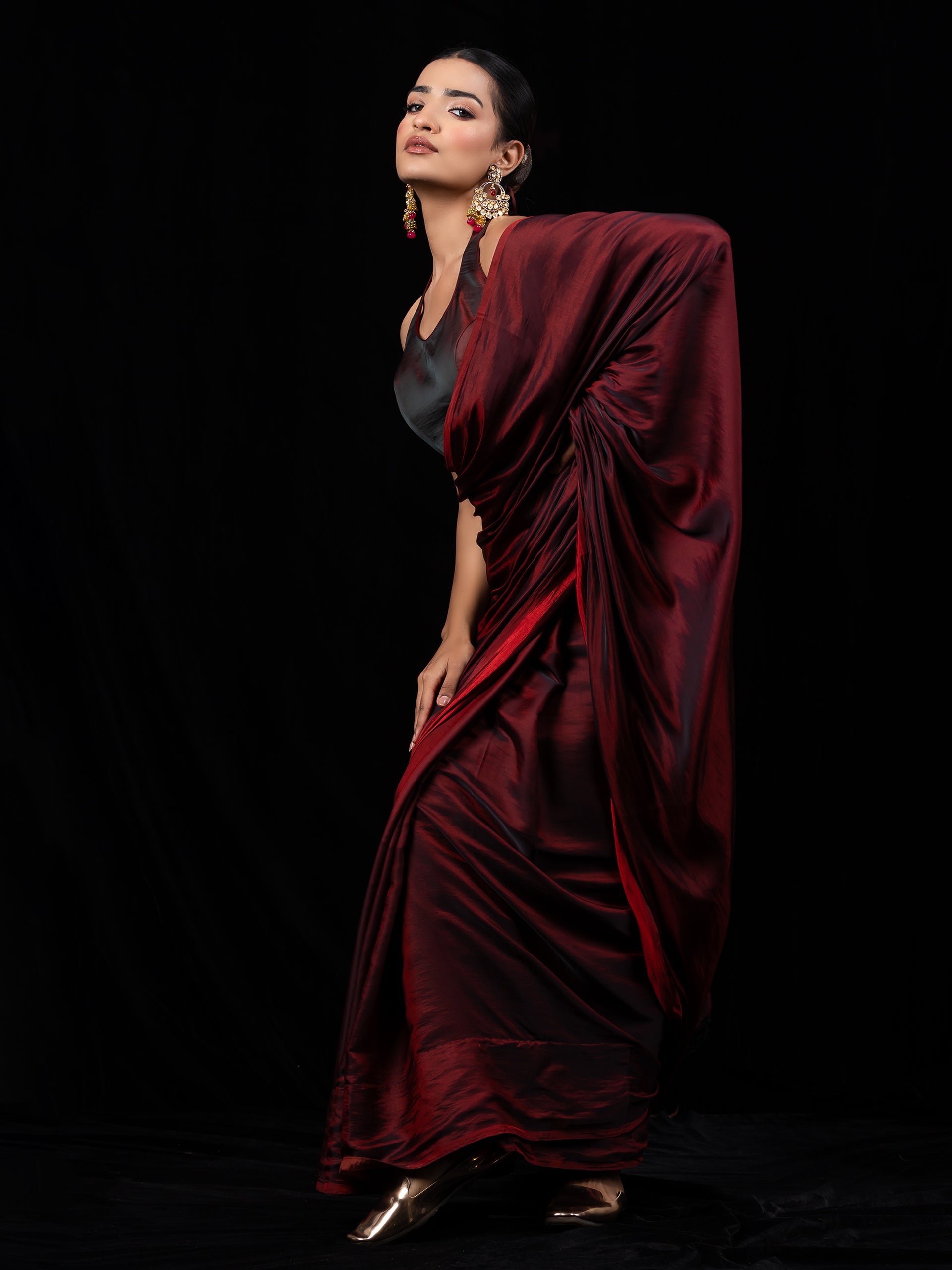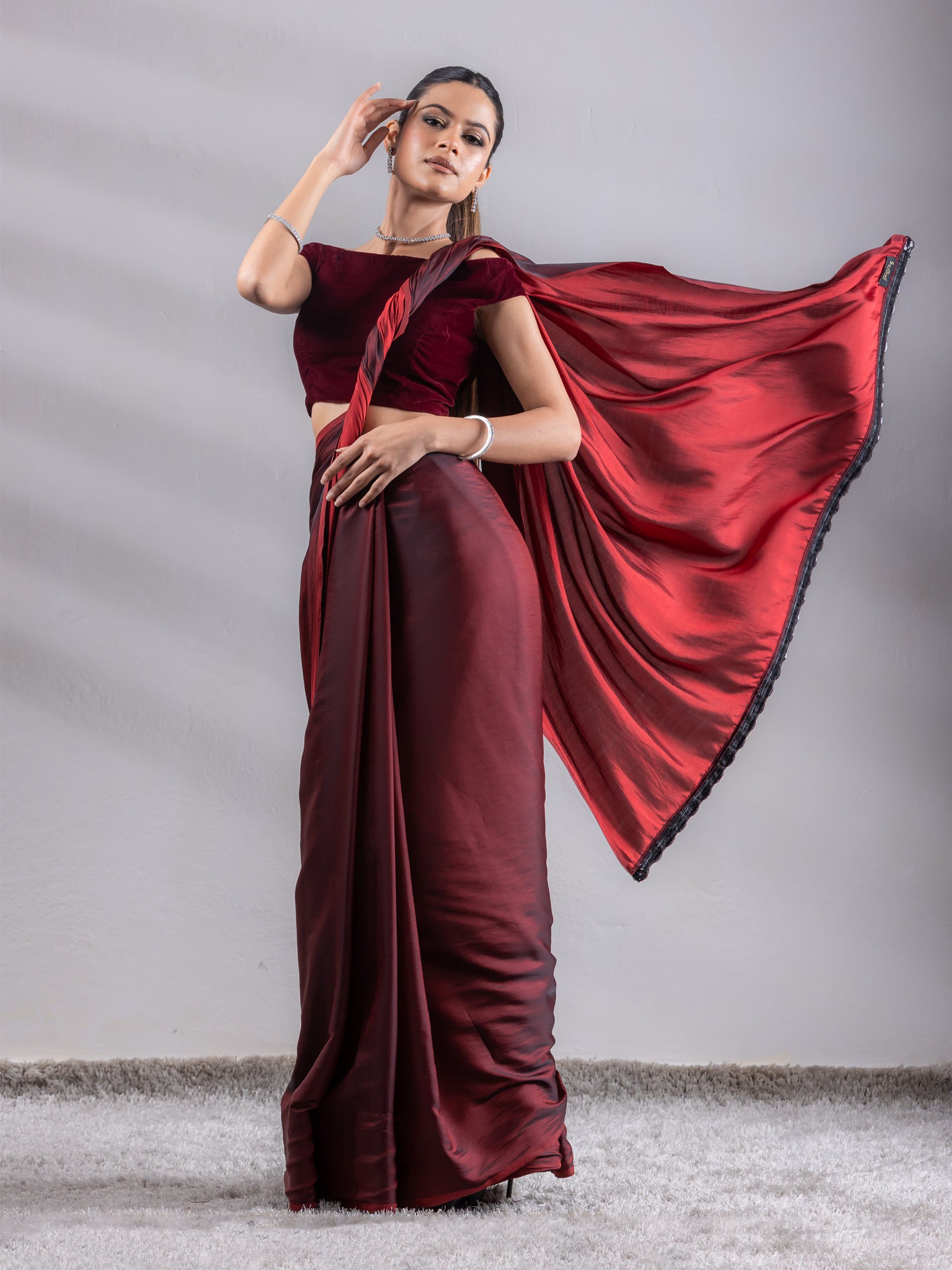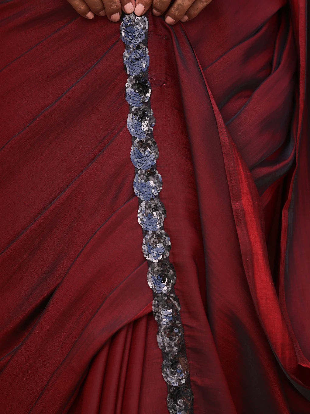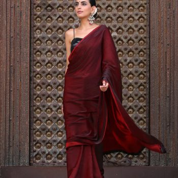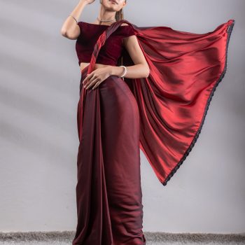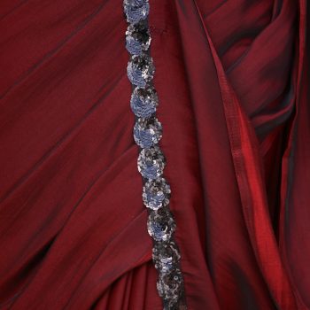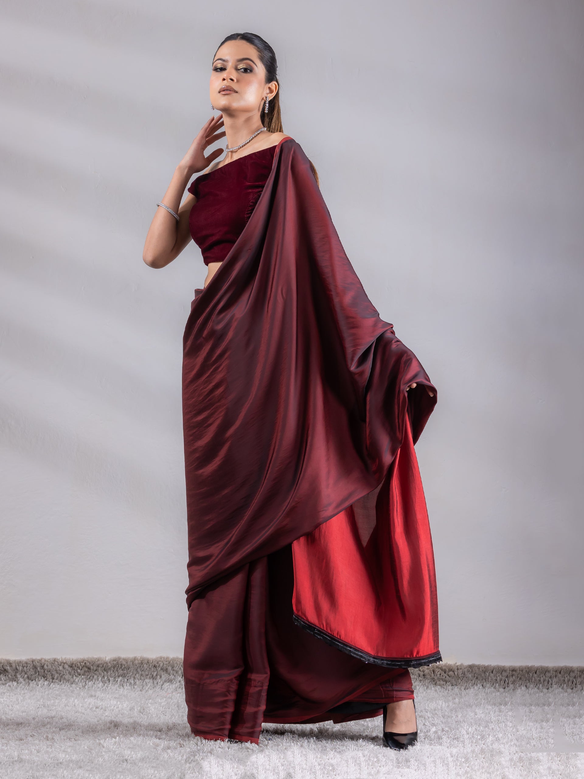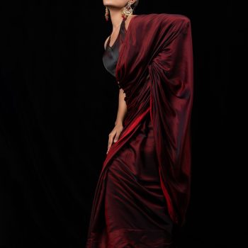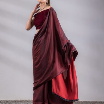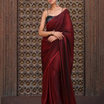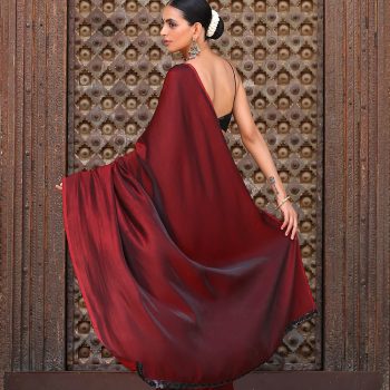 Colour:- This paradise satin saree comes in Dual Hues of Deep Maroon and Ebony Black.?This combination?exudes?confidence, elegance, and maturity.