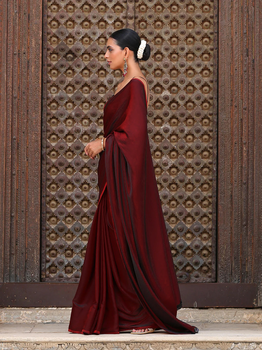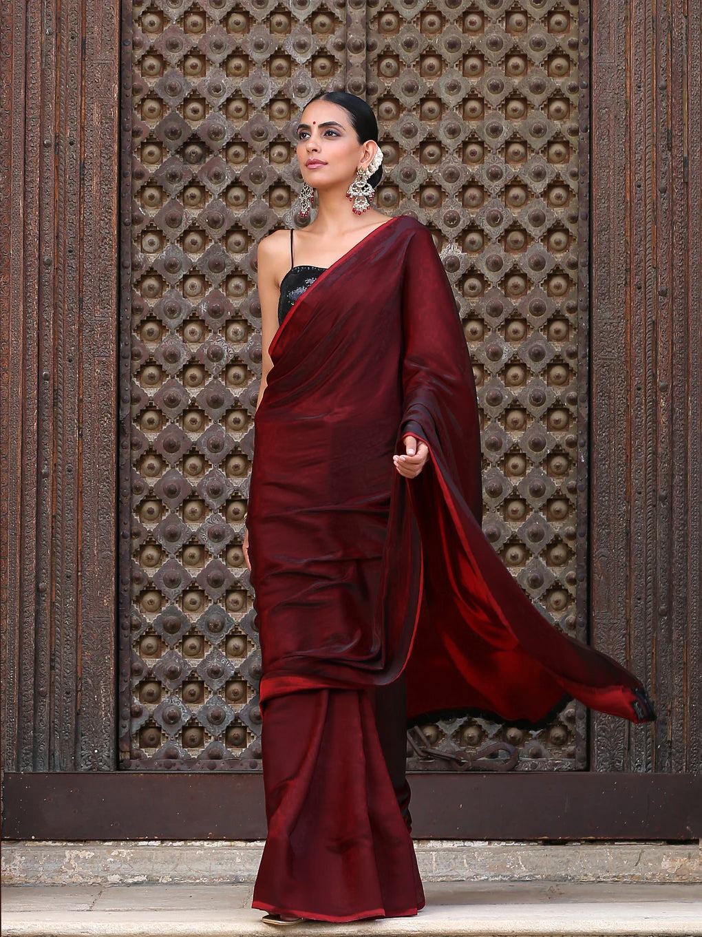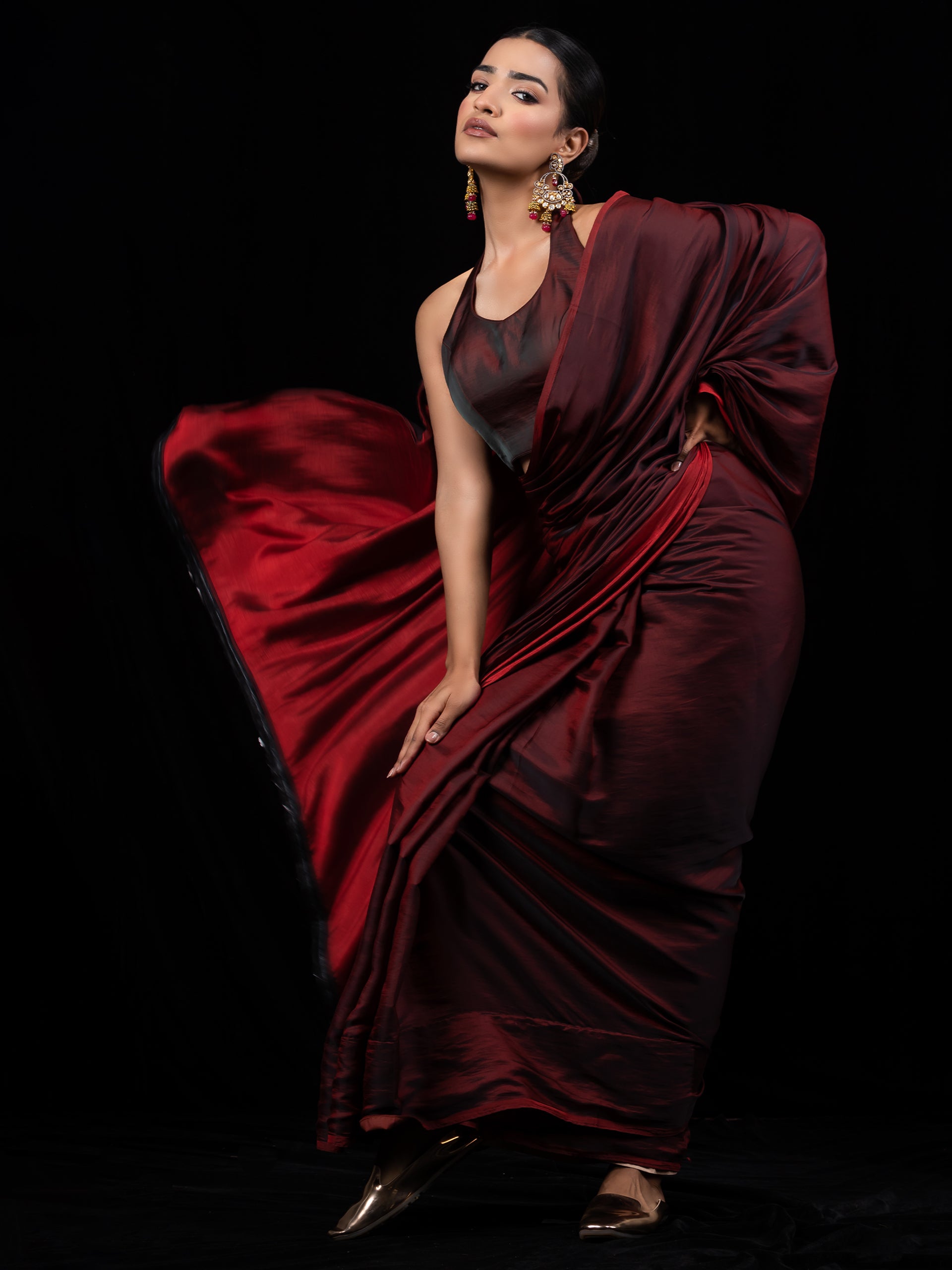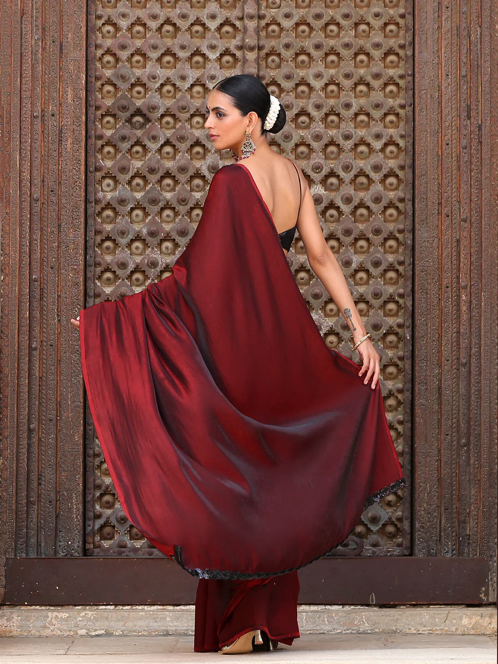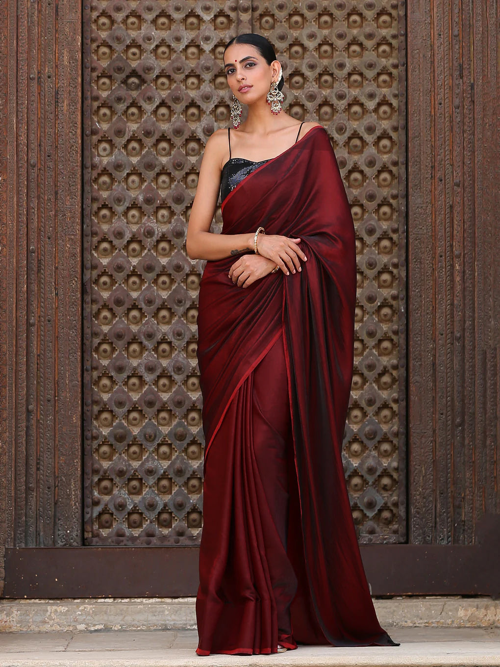 Colour:- This paradise satin saree comes in Dual Hues of Deep Maroon and Ebony Black.?This combination?exudes?confidence, elegance, and maturity.